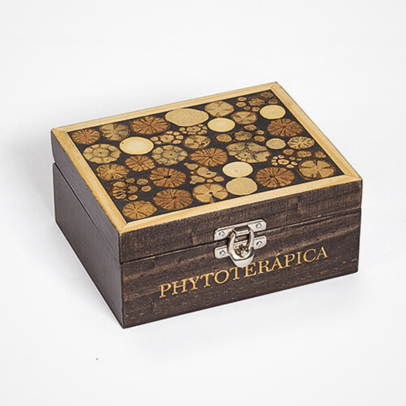 Fabricada de forma artesanal, a caixa de madeira da Phytoterápica apresenta uma arte exclusiva em marchetaria, feita com aparas de podas de árvores.