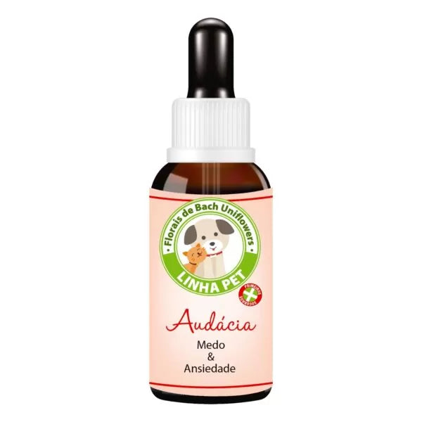 Floral Pet AUDÁCIA é indicado para qualquer evento chocante, assustador ou angustiante. Auxílio antes, durante e após qualquer situação que deixa seu animal de estimação ansioso ou inseguro. Ajuda a aliviar o estresse. Para emergências ligadas ao medo (fogos-de-artifício, trovões, veterinários, etc.), choques, nervosismo, timidez em público, superproteção, estresse de viagem.
